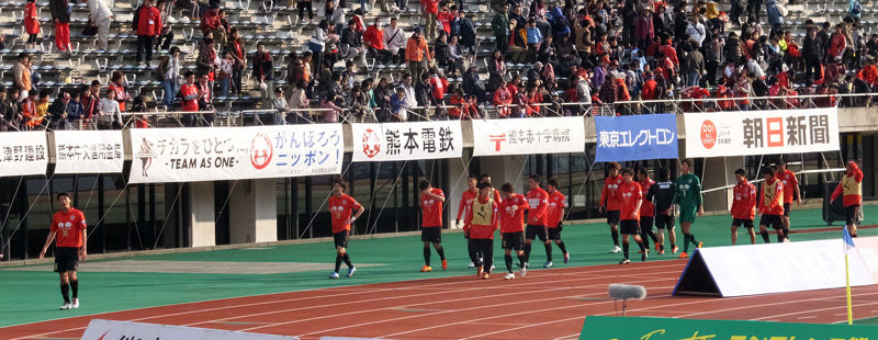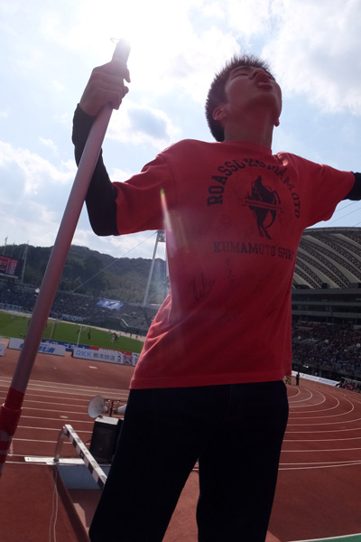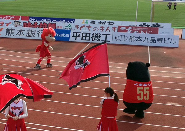 HTにはLフラッグのお嬢さんたち。アウェーのクラブ所属ガールズに比較するとどうしても急造チームのバラバラ感否めません。昨年アウェー札幌のコンサドールズ。あの寒風にびくともしない笑顔とフラッグアクションが思い出されます。熊本のみんなも精進してください。