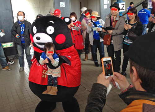 北ゲートのブリッジを歩いてたらスタジアム入りする彼を発見。くまモンはその姿でお姉さんと一緒にやってきてそのまま帰ります。ちなみに、この日大分から来てた「彼」は試合後には大きなビニールに包まれて動かぬ姿となって帰って行った模様。ナイショだけどね(笑)
