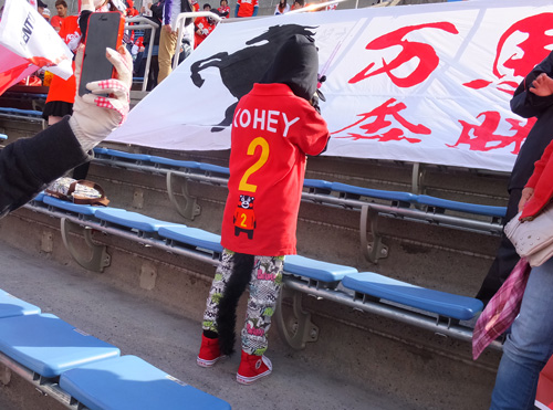 それがまあ巨大なシロモノで。アルデラスの皆さんが横浜FCスタッフの方と協議しながらあっちこっち持って回った結果、ようやくTV中継で映った位置に納まった。(くまもとの赤が見えるよう)