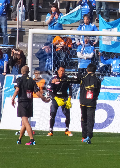 最初に出てきたのは横浜FCのGK陣。そうです。ハマのユータくん熊本サポの視界に初お目見えの図。もちろん向こう側だしウェアの色も違うし何よりヘアスタイルが(笑) というわけで出てきたはいいけど、最初はどこにいるのかわかりませんでした。