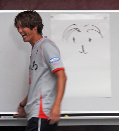 次の出し物準備まで、絵心対決のボード裏に選手が描いてたラクガキを見せてくれて解説するチカラさん。結論「絵の下手な人は描くもんがちっちゃい」……納得。