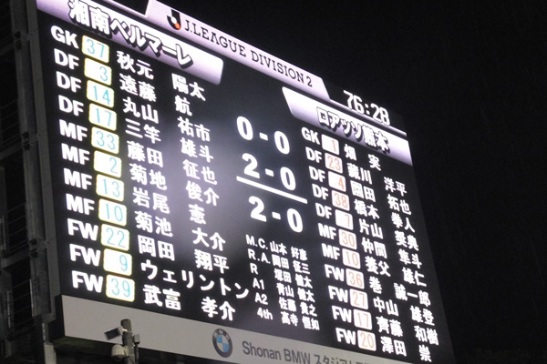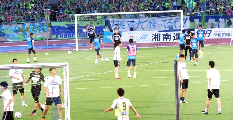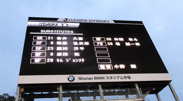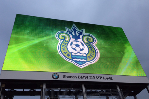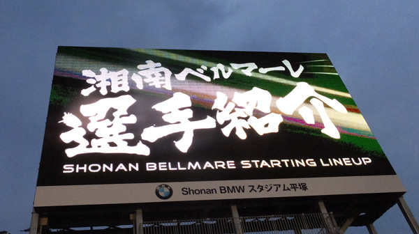 で。頭上のスクリーンでは湘南のエンブレムがクルクル回ってました。何か見たことあるなあと見ていて思い出した。踊る大捜査線TVシリーズのとき、湾岸署のパソコンのスクリーンセーバーがこんな感じでODSマークがクルクルしてたっけ(古)