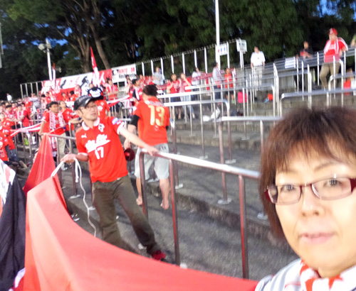 この時またしてもゲーフラ上げられなかったのは、ビッグフラッグを担当していたから。アウェーではいかにゴール裏を赤くするか。これもとても大事。