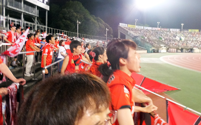 めっちゃ近くで打ち上がったので、燃えかすが降ってくるしスタ内は煙で真っ白。海外のスタジアムでよく見るけど、発炎筒つけて振り回すとこんな感じなんだろうな。