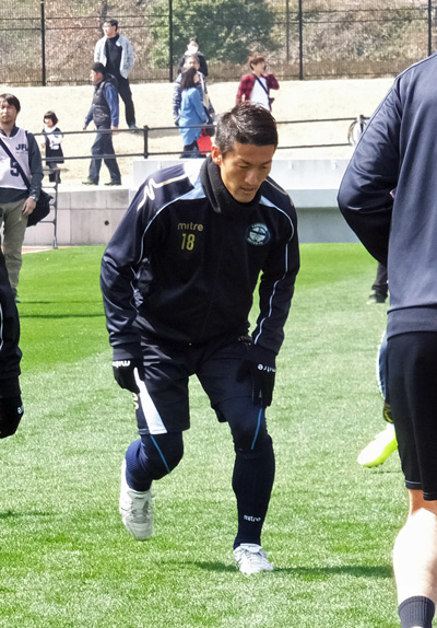 試合前ストレッチの甲斐くん。こんな姿を本当はロアッソで見たかったんだけどね。