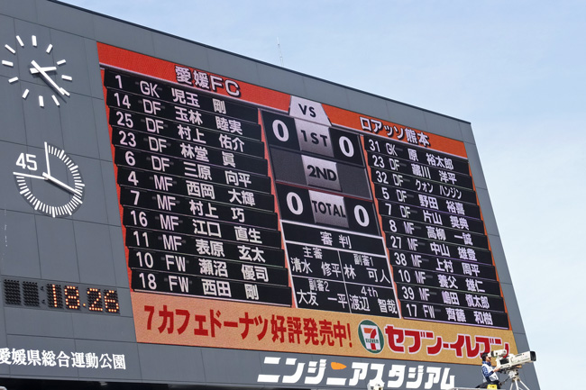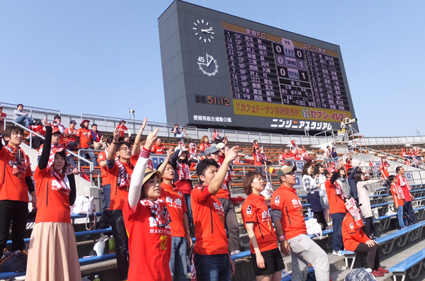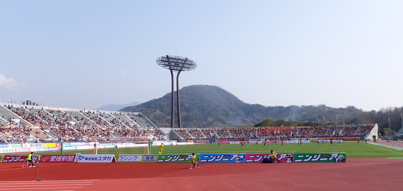 素晴らしいスタジアムにもかかわらずこの入場者数は本当に寂しい。アウェーサポももっとがんばるから愛媛の皆さんにもぜひこのきれいなスタジアムへ来て欲しいものです。