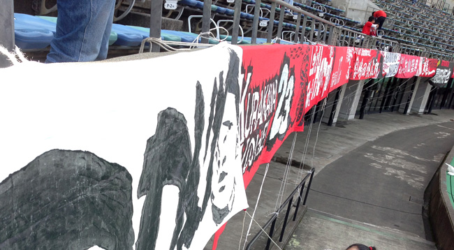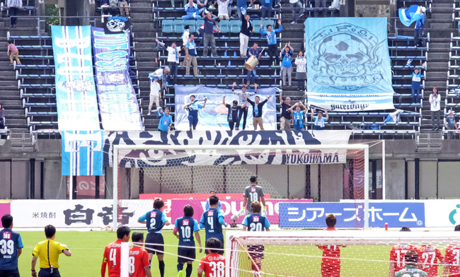 勝利が決まった瞬間、中央のエンブレム幕の上をゴロゴロ転がって喜びを全身で表現していた横浜サポの皆さん。アザ出来ませんでしたか?(笑)