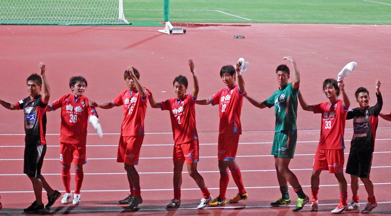 ガイナーレの選手たちがゴール裏へ。自分たちのサッカーがかなり出来たんじゃないでしょうか。リーグ戦がんばってまたJ2上がってきてください。自分はまだ鳥取に行ったことないんですから(^^)/