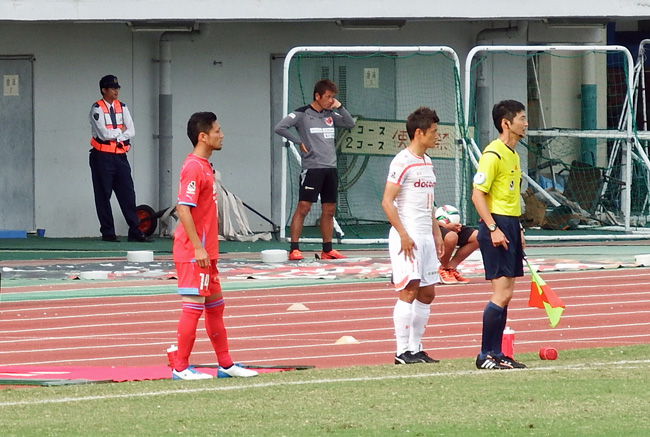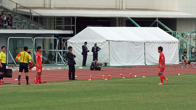 ロアッソベンチ。考える人ポーズで固まるコーチ陣。