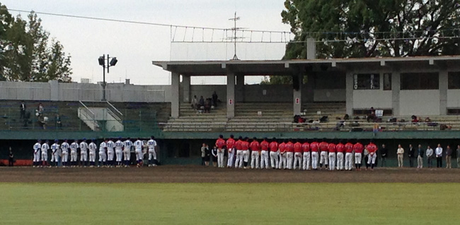 選手登場。ズームしたら女子マネの鈴木みのりさんの後ろ姿。彼女を写真に収めたの初めてかも。