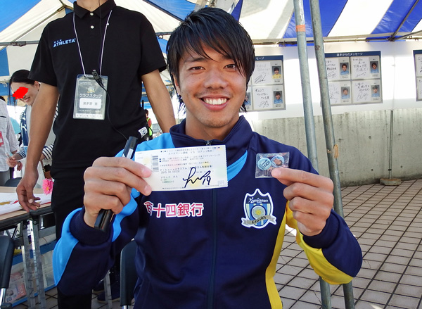 慌てて来ちゃったのでサインもらうモノがなくて、この試合のチケットにさらっと書いてもらいました♪ ついでに先ほどガチャガチャでゲットしたバッジ持ってもらっての一枚。