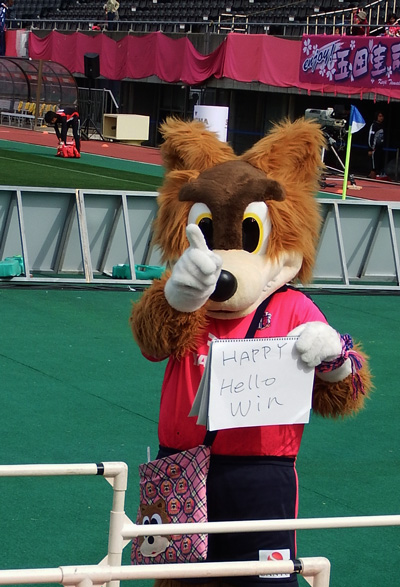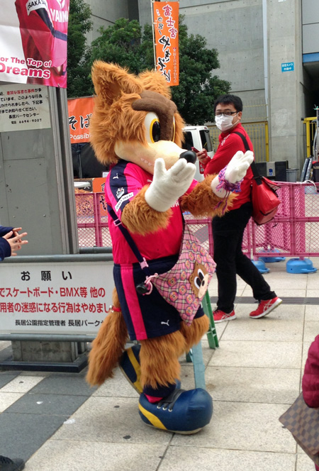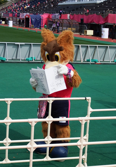 モサモサのロビーくんがのんびりアウェー側にやってきました。同時に熊本のマスコットマニアの皆さんが色めき立ちます。
