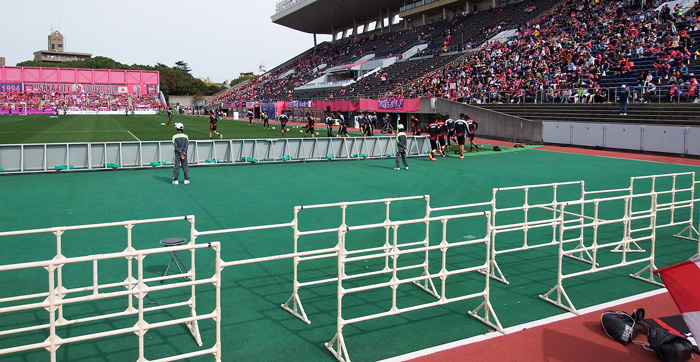 ゴールマウス手前の見慣れぬ物体は、リボンビジョンの裏側。アウェー側にはこれがあってゴールラインが全然見えない。笑っちゃうほどいろいろ邪魔くさいのもアウェーを徹底的に居心地悪くする手段らしい。