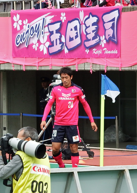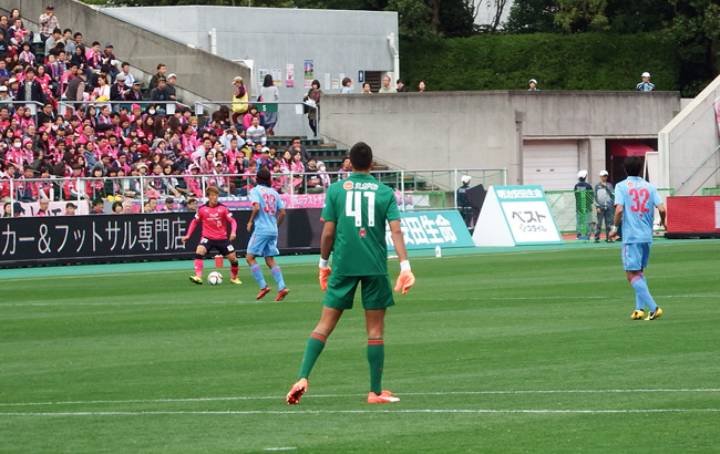 そんなこんなでこちら側へ攻めるセレッソのCK。目の前に玉ちゃん。こちらから撮るとバックに例の横断幕。できすぎの構図です。