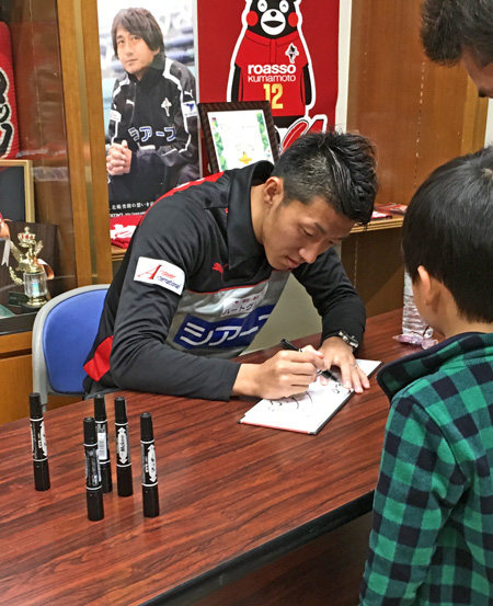 イベント参加選手のお一人。ちびっ子サポとサッカーゲーム対決でハンデをつけるってことで、視界が狭くなるこんなメガネ着用。見えねえ!と顔上げた瞬間見物衆大笑い(^^)