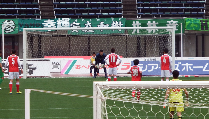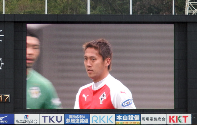 キヨタケくんのプレーがファールを誘ってPK今シーズン2度目。昨シーズンPK何度やったっけ。それが開幕3試合で2つめ。ワタシの知ってるロアッソ熊本じゃないよ……