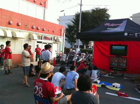 いつもはホームゲームのコンコースにお出ましになる香梅さんのテントに鎮座するデジタルテレビ。これで少々の雨模様でもTVは濡れないし試合前半射す西日も遮るという寸法ですね。