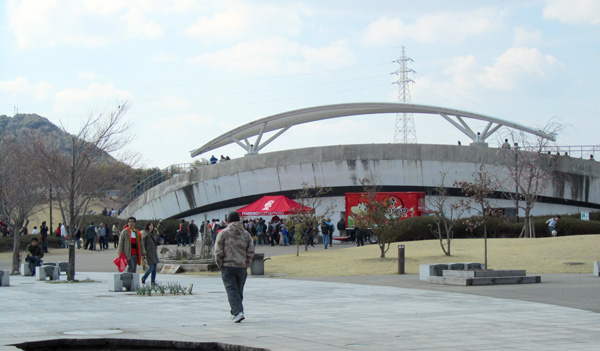 KKWINGの西側から運動公園に入り坂を登って行くと、昨日の練習とはまるで違って、まだTMが始まる1時間以上前だというのに多くの人が補助競技場に向かって歩いていました。