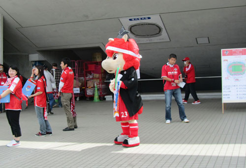 途切れることなく入場されるお客さんにサンバイザー配っていて、ふと振り向いたら、なんと子供の日仕様の初号機ロアッソくんがいて「ええっ!?」と驚いたんですが、仕事集中していて少し余裕ができて振り向いたらもう弐号機ロアッソくんに入れ替わっておりましたよ。……あの初号機くんは幻かしら?!(笑)