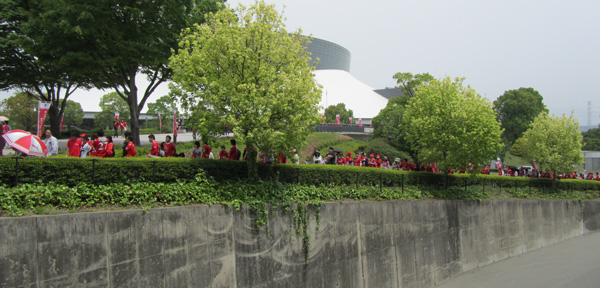 その間、先日来「北九州戦には参戦します」とおっしゃっていた「菊池赤馬衆」の皆さんがホラ貝の音も雄々しく堂々の入場! きゃーカッコイイ!一緒に写真撮っていただきたい〜と思いながらも、募金活動に参加された皆さんをチラチラと横目で見るのみ(^^;) この時ばかりは欲望と戦うのにウズウズしまくりましたわ(笑)