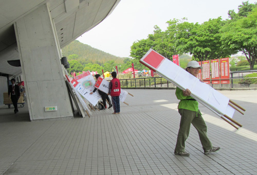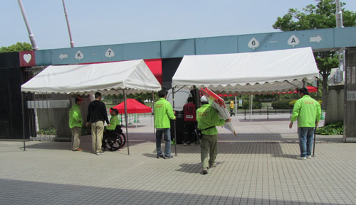 最初の作業はマッチデープログラムにポケモン映画のチラシを挟むこと。これはひたすら単純作業。風が吹いてチラシが飛んでいくのを押さえながら、ゲート担当メンバーの皆さんとともに、本日のボランティアの高校生くんと並んで黙々と配布用のマッチデープログラムを作っていきました。