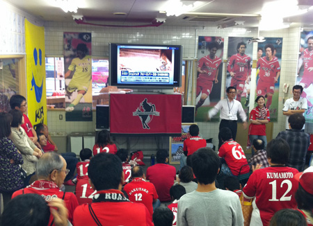 中継が始まったときから、画面からはロアッソ熊本サポーターのチャントが大きく聞こえていました。こちらも負けじとリーダーさんと共にコール開始。