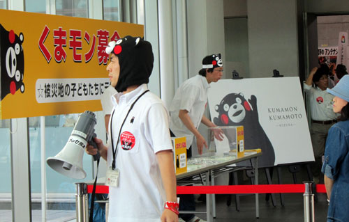 ファンの親子連れに密着されて愛嬌振り撒いていたのが、離れたところから「くまモーン!」と呼ばれるやいなや脱兎の勢いですっ飛んでいきました。