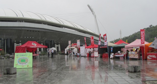 雨がやまないのでグルメもお仲間とのおしゃべりもコンコースでまったりと。どれだけ雨が降っても、どのカテゴリの座席の人も濡れずに食事や待機ができるKKWINGですから、ぜひロアッソの応援と共に楽しい雨の日を過ごしましょー。
