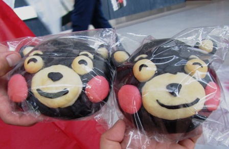 雨のせいかお客さんが少なくて申し訳ないよーなグルメ広場で、パン屋さんのくまモンパンをゲット。お仲間もゲットされたので奇跡?のツーショット。