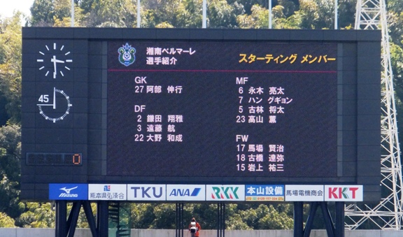 湘南のスタメン。ちょっと字が小さいだろーと思ったけど、よく考えたらこれを見せるのは主にアウェー側。この大きさでも良いわけ……なのかしら(^^;)