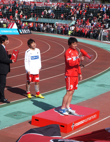 1年前、たしか大震災による中断後のリーグ再開試合でJリーグ初出場初ゴールして、ゴール裏でサポーターに自分のコールやってもらってダンス踊ったロアッソ最初の選手が彼でした。(説明長い(^^;))