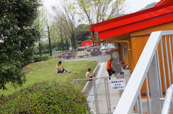 そのまま通路を歩いていくと建物裏側から階下に降りるスロープがついています。車椅子の方も、ぜひロアッソの練習を楽しんでいただきたいですねー♪