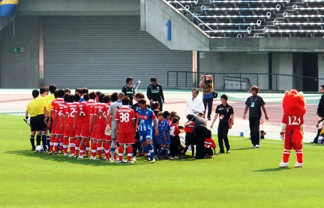 ロアッソの選手も戦闘態勢でピッチに散り始め、試合直前の張り詰めた雰囲気の中、そこだけホンワカ状態。