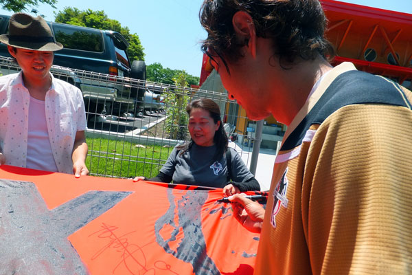 選手幕にサインをもらって初めて完成となるんですよね。いつもは平日の練習後にサインしてもらうことが多いのだそうですが、今日はラッキーなことにその場に立ち会わせていただくことができました!