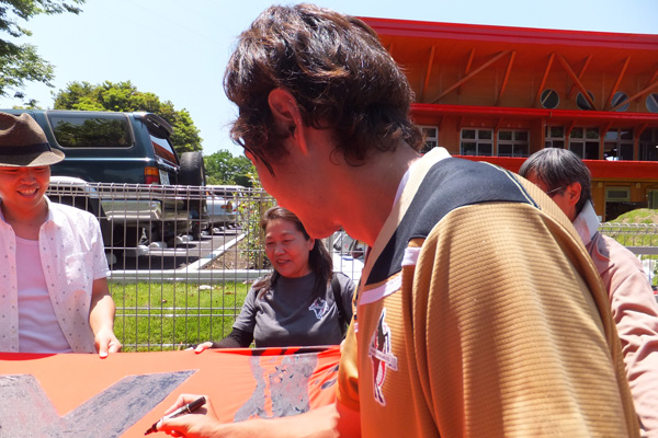 人生初の赤い選手幕をかなり見つめてから「いいですねえ」と言いながらサインです。