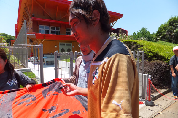 普通なら試合日の日曜だけど今日は練習です。昨日作成した選手幕のうちキタジくんにサインをもらうとSさんがおっしゃったので、同道させていただきました。