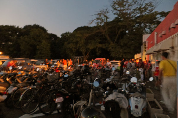 いったん外に出ると、外のモニターの周りもこの人垣。日が沈んで、ナイターそのものです。