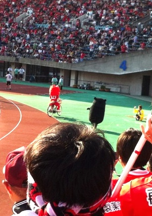 子馬はアビーくんから槍を強奪して、チャリで熊狩りに走ってきた。ころうくんの自刃ネタといいけっこう武闘派芝居が多いのがロアッソマスコット小芝居の特徴かもしれない。