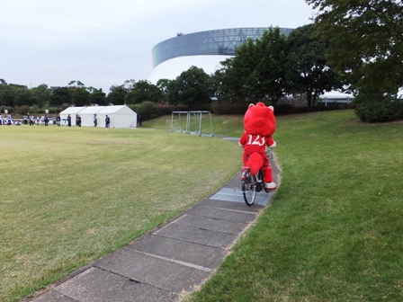 直後になぜかチャリを飛ばしてきたロアッソくん。スロープのヘアピンカーブをものともせずイベント広場にまっしぐら。