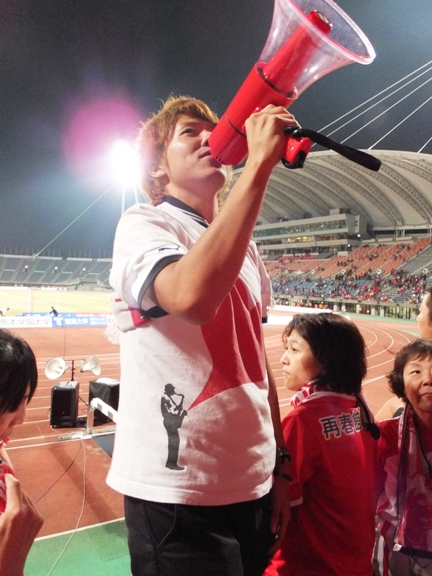 勝ったら選手はピッチ内で待機。最近はここに飲み物や着替えが運ばれてきます。チームの方もすっかりカモンロッソコースができあがってるのが楽しい。